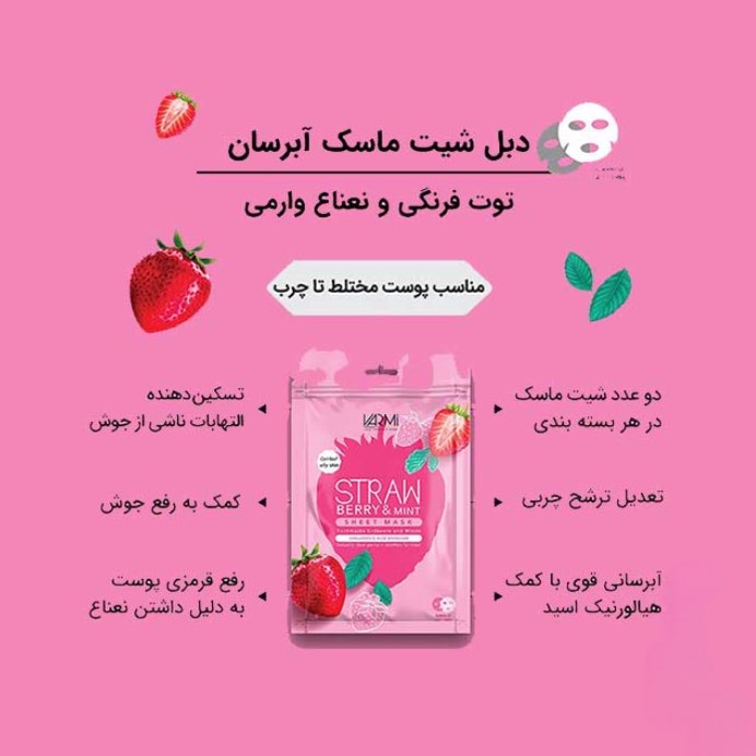 دبل شیت ماسک وارمی حاوی عصاره توتفرنگی و نعناع یک ماسک ورقهای دولایه است که برای پوستهای مختلط تا چرب طراحی شده و بهطور همزمان شادابکننده، کنترلکننده چربی و کوچککننده منافذ است.
